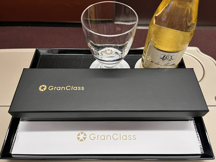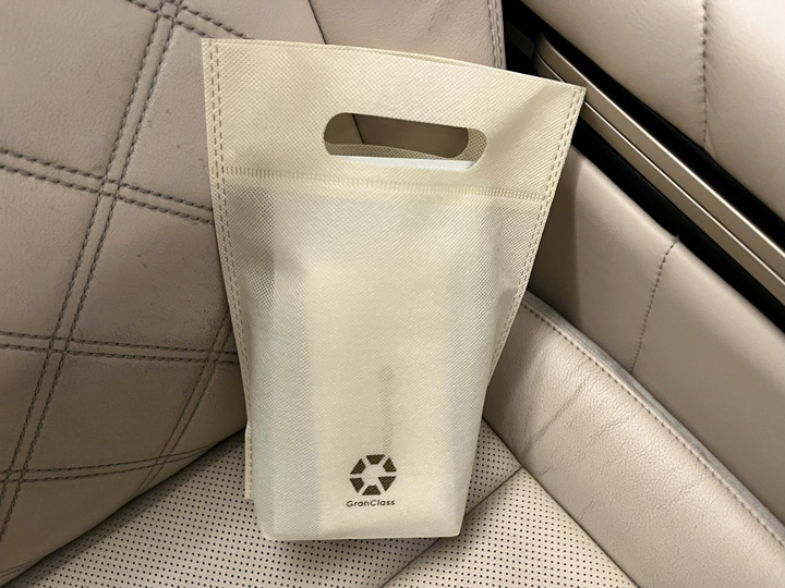 客室に入ると高級感のあるシートとオシャレな間接照明の内装に圧倒されます。席に着くと、さっそく、おしぼりとお水とおつまみのセットをもらいました。さらに席にはスリッパも用意されていました。座席はリクライニングをしても後ろの人に迷惑が掛からないようになっていますし、思いっきり足を伸ばしてくつろぐことができます。