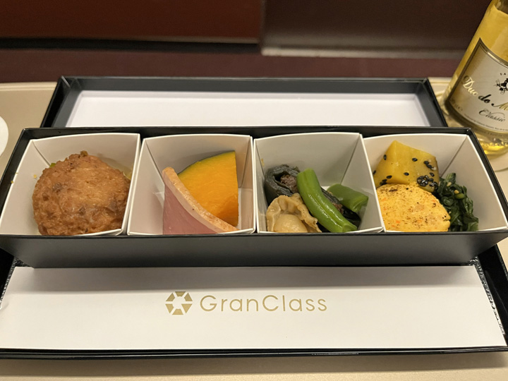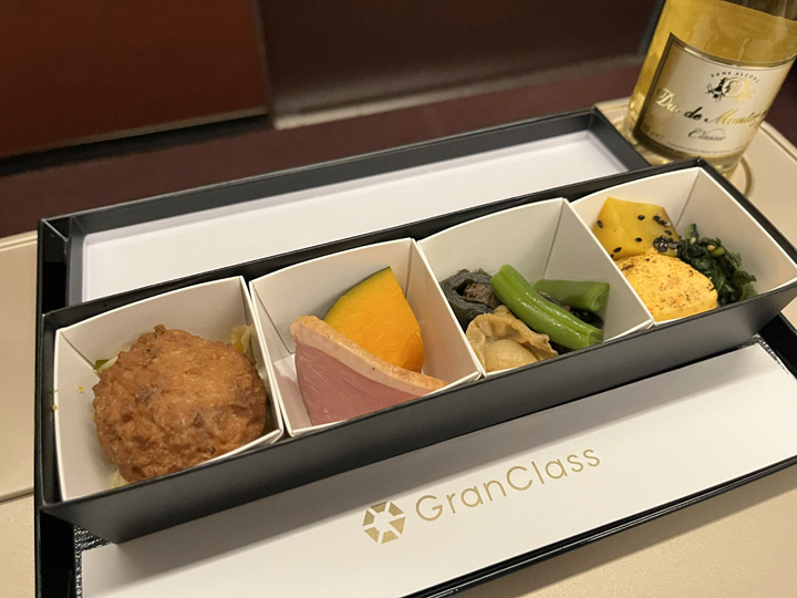 列車の種類にもよりますが、この列車ではドリンクと軽食のサービスが付いていました。ドリンクはリクエストすれば何杯でもいただくことができます。軽食は和食を選んでみました。4つの小鉢のお料理はどれも完成度が高く、ノンアルコールスパークリングワイン(アルコールが苦手なので)と共に美味しくいただきました。