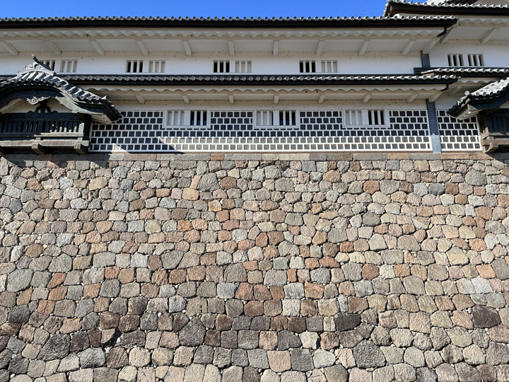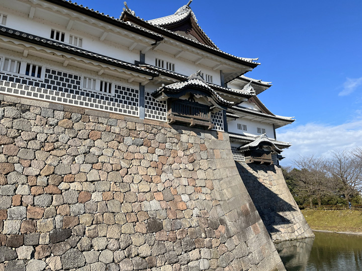 金沢城といえば、鉛瓦を使った白い屋根やなまこ壁と呼ばれる模様が有名なようです。天守閣や本丸は残っていませんが、城郭を構成している何層もの堀や高い石垣、たくさんの門を見ているだけで強固なお城であることをうかがい知ることができます。立派な石垣に圧倒される一方、所々で震災の爪痕が残っていました。