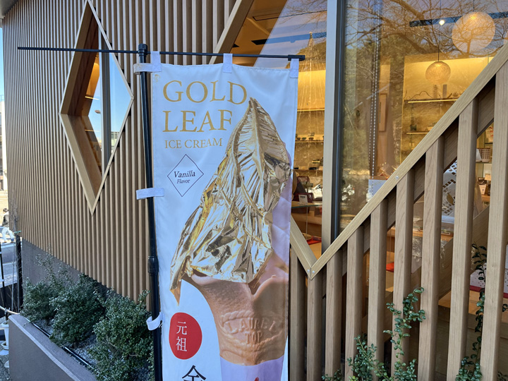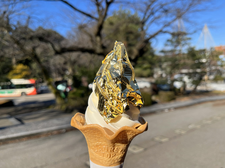 「箔一」というお店の金箔ソフトクリームをいただきました。味は普通のソフトクリームですが、食べると歯や口の周りがキラキラします…。