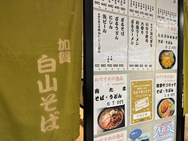 金沢駅の駅ビルに入っている「加賀白山そば」で白エビかき揚げうどんをいただきました。甘みのある出汁や香ばしさが残るかき揚げが美味しくて、リピートさせてもらいました。寒い日はうどんの温かさが身に染みます。