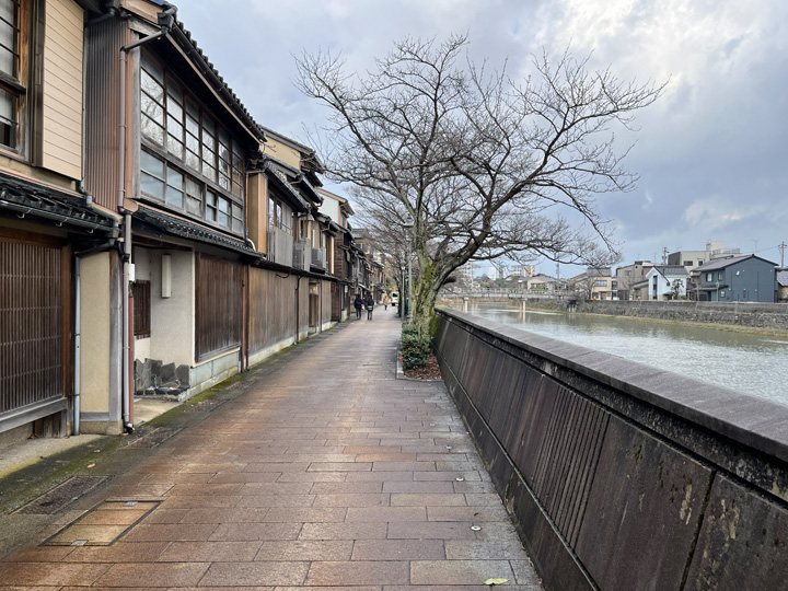 ひがし茶屋街とは対照的に主計町茶屋街は人通りが少なく、のんびりとした時間を過ごすのに最適。川沿いをひたすら歩くのも良いかもしれません。