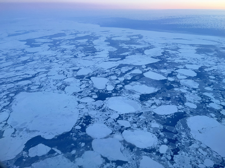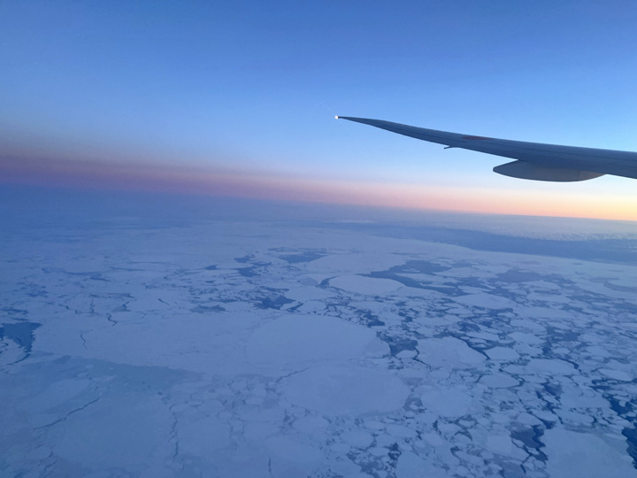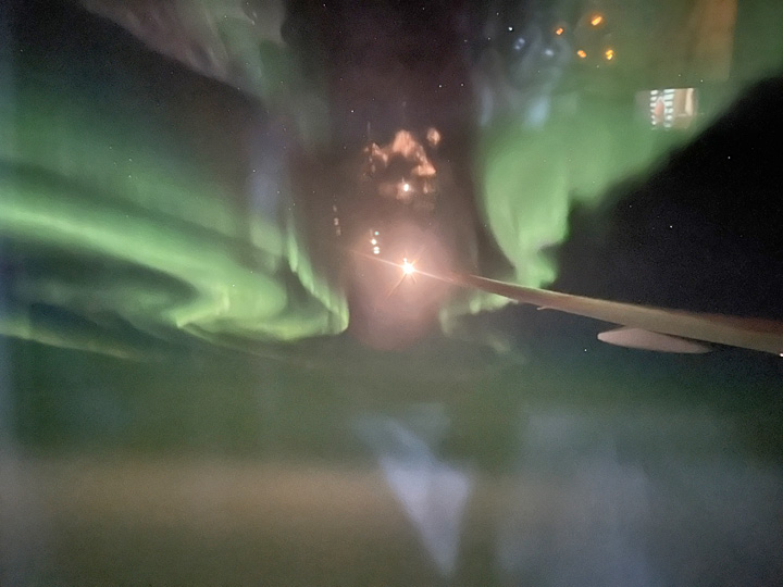 機内は満席。古さを感じますが、座席は思ったよりも広く、フットレストが付いていました。夜中に足がつることが多いせいか、足がよくむくみました。昨今の世界情勢を踏まえて、通常のルートよりも大きく迂回しながら北極圏をまたいで飛行しました。途中アラスカを過ぎた辺りから、オーロラが見えました(ただし、肉眼では、はっきりと見えません)。