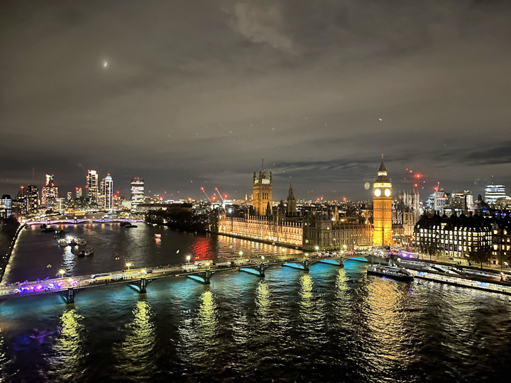 仕事の合間にビッグベン周辺を散策していたところ、色鮮やかにライトアップされている観覧車を見て、つい乗ってみたくなりました。当日券は日本円で8千円超…ちょっとお高いですが、この機会にしか乗ることがないと思って奮発しました。ゴンドラに乗り込むと、ロンドンの夜景を360度眺めることができます。テムズ川越しにビッグベンを眺めていると、ロンドンに来ていることが実感できます。