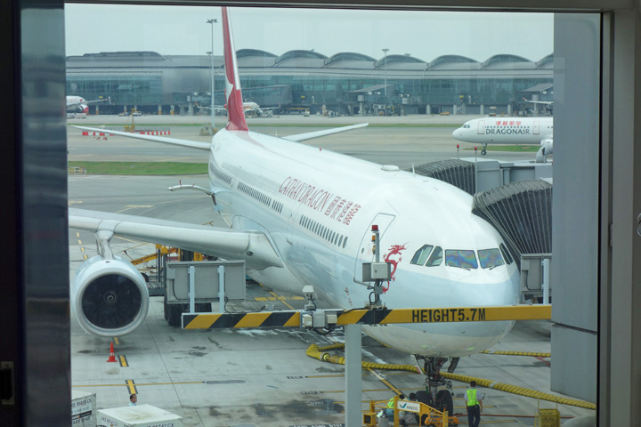 キャセイドラゴン航空はLCC並みに座席が狭い。背もたれを倒すともっと狭い…。ひざがぶつかって、とても窮屈でした。わずか4時間の飛行でしたが、長時間待ったこともあって、早くも疲れてしまいました…。