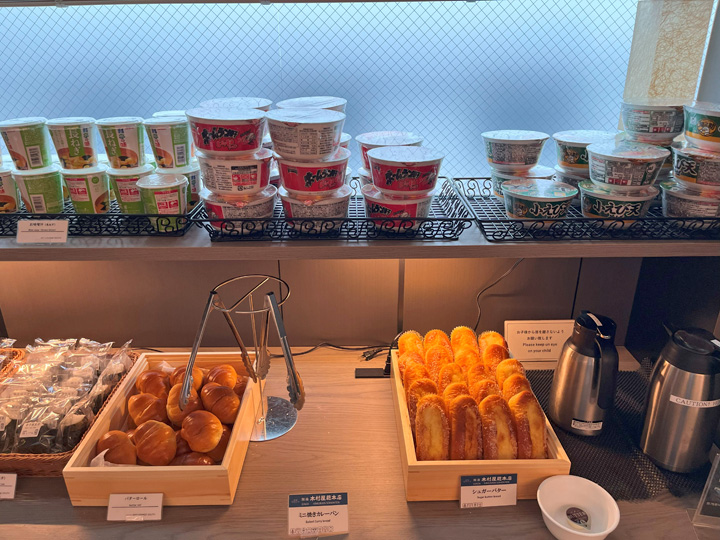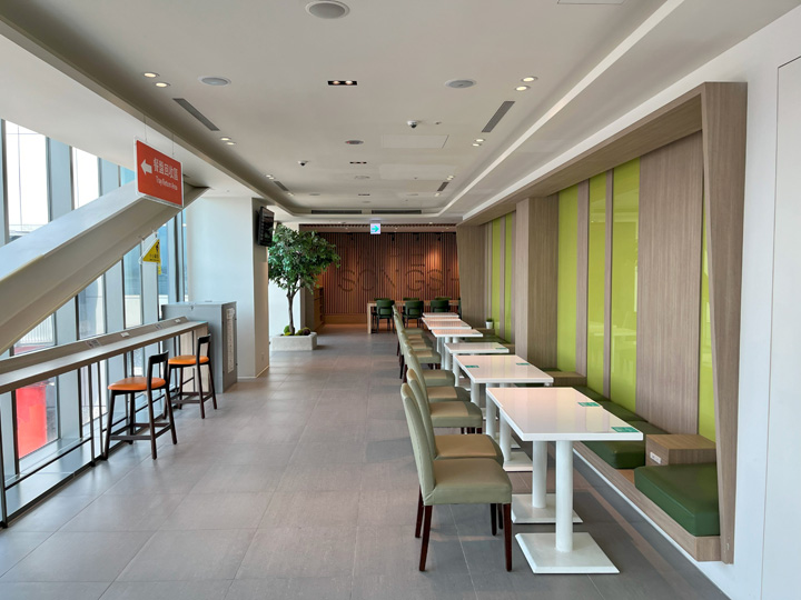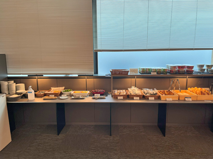 ほとんど使う機会がないプライオリティパスを使って、有料ラウンジを利用しました。「スカイ・ラウンジ・サウス」というラウンジがプライオリティパス専用のラウンジになっているようです。ラウンジ自体はエントランスの下のフロアにあるため、景色は全く楽しめませんが、少し暗めの落ち着いた空間となっていました。軽食は、おにぎりやパン、カップ麺といった主食系が中心で、プライオリティパスで入れるラウンジとしては無難な感じがしました。