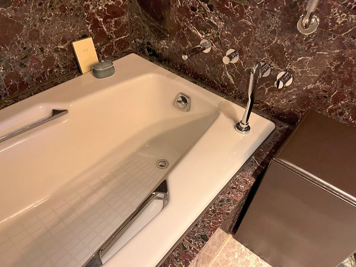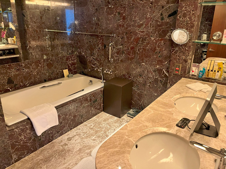 バスルームはシャワールームが独立していたり、ダブルシンクやウォシュレットが設置されていたり、設備・アメニティともに充実していました。テレビはお部屋ごとに設置されていますので、バスタブに浸かりながらテレビを見ることもできます。ただ、大理石床のバスルームは滑りやすくて危険…。