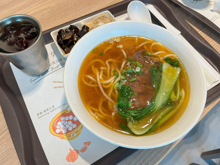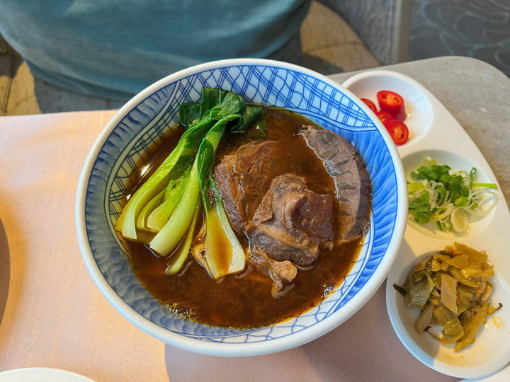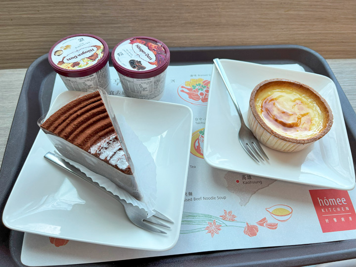 帰りの台北松山空港では、プライオリティパスが使えるラウンジはありませんが、代わりに「ホーミー・キッチン」というレストランを利用することができました。指定されたセットメニューの中から選ぶことになるのですが、牛肉の煮込み麺のセットを選びました。セットには飲み物とスイーツとアイスクリームが付いています。牛肉の煮込み麺が意外なほど美味しくて、混雑しているラウンジを利用するよりも満足度が高いような気がします。