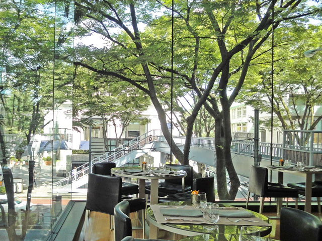 表参道はケヤキ並木があるせいか、気温が高いのに少し涼しく感じます。人の多い表参道から2階のカフェに入ると、ガラス張りで外からの光が取り込まれた店内で、外にいるような気分になります。