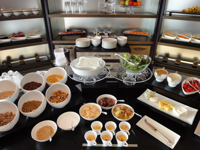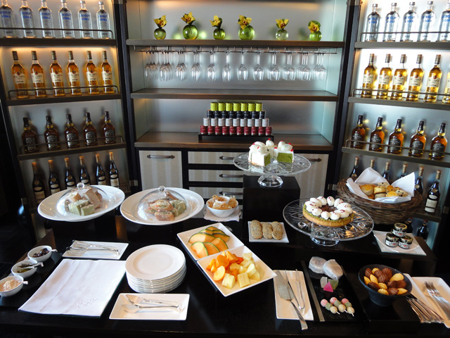 クラブラウンジでのチェックイン。ロビーと違って慌ただしくなく、静かな雰囲気が漂っていました。チェックインを済ませた後、クラブラウンジでティータイムが行われていましたので、さっそく利用してみました。フードコーナーではサンドイッチやケーキなどの軽食がキレイに並んでいます。