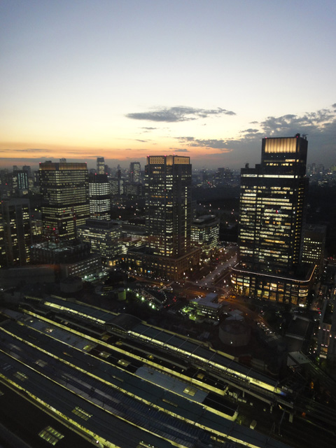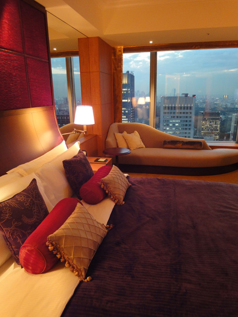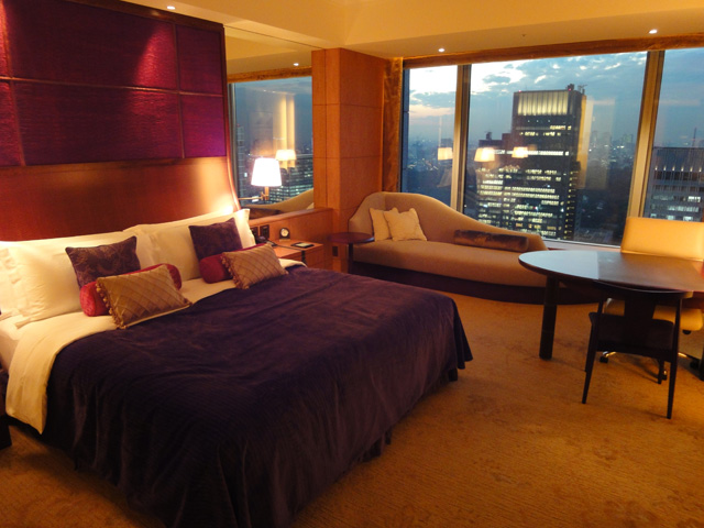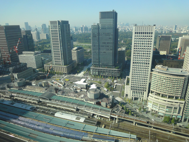 続いてお部屋に案内してもらいました。やや派手な内装が特徴的。とても広いお部屋で、鏡が多いせいか、お部屋がさらに広く見えました。そして、目の前に丸ビルや新丸ビル、東京駅が見えて、その背後には皇居や武道館も見えました。まだオープンして1年半しか経っていないので施設が新しく、そしてアメニティーも充実しています。