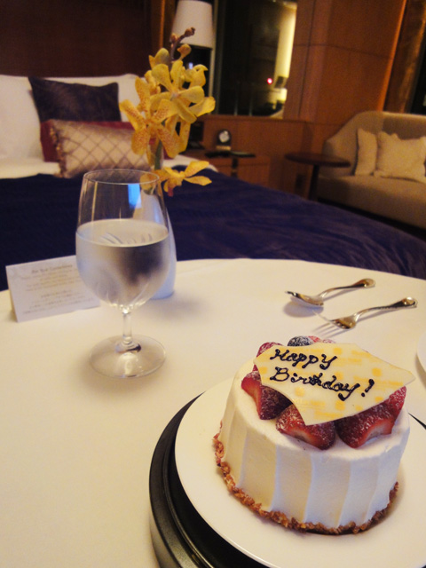 お部屋に戻ると、ホテルから誕生日ケーキのサービスが届きました。メッセージカードも添えられていて、心のこもったおもてなしに嬉しい限りです。