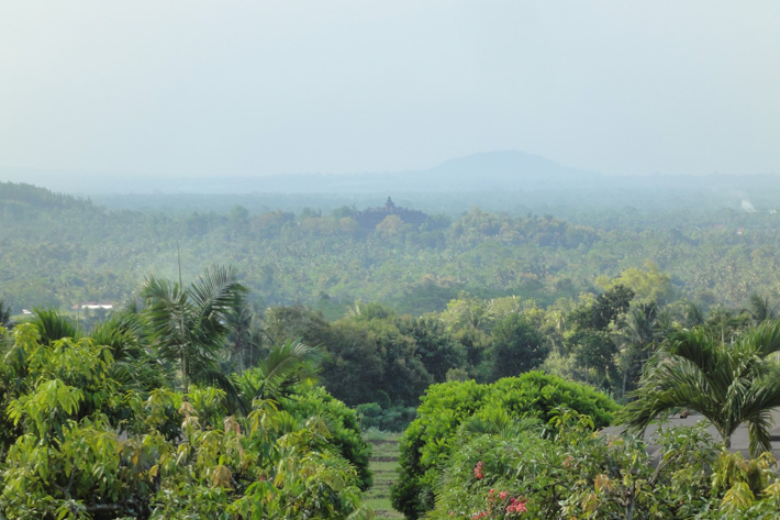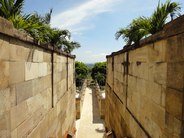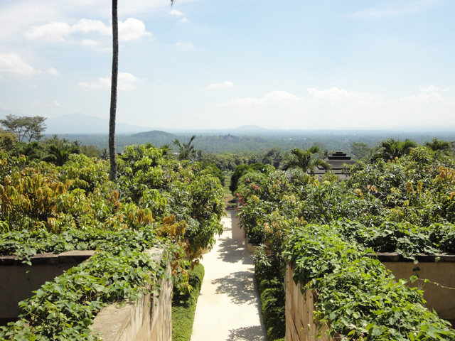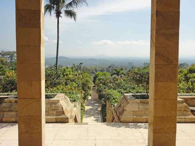 アマンジオは、ボロブドゥール遺跡をイメージしたような建物になっていて、様々なところでシンメトリー(対称)のデザインが取り入れられています。メインの建物から、さっそくボロブドゥール遺跡が見えてきました。
